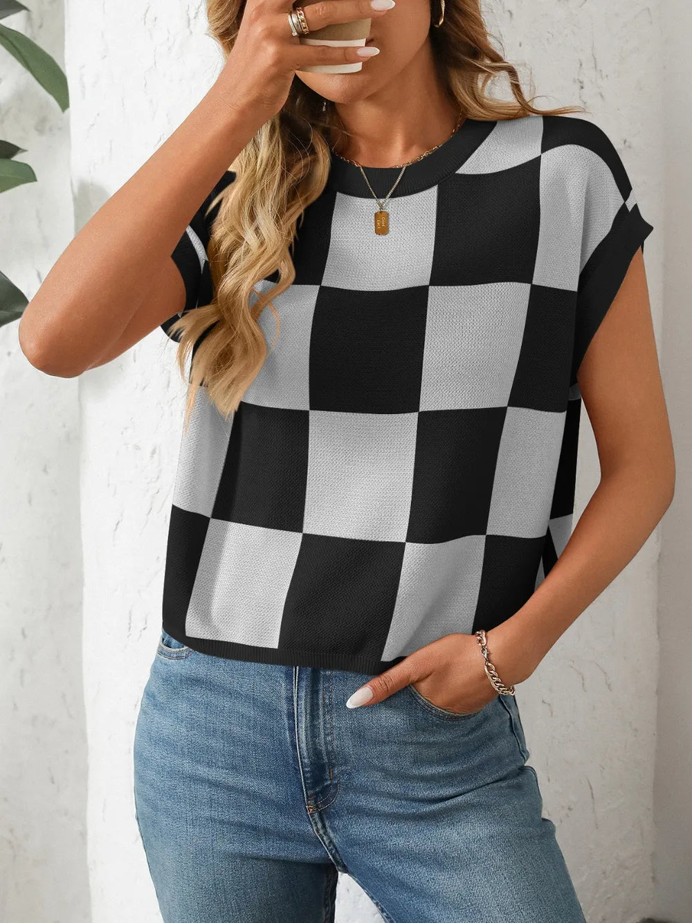 Mandy Checkered Round Neck Cap Sleeve Knit Top