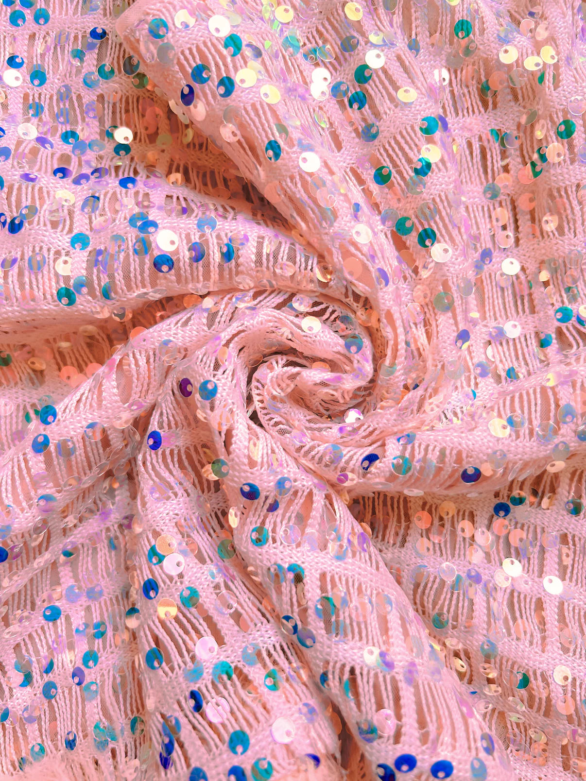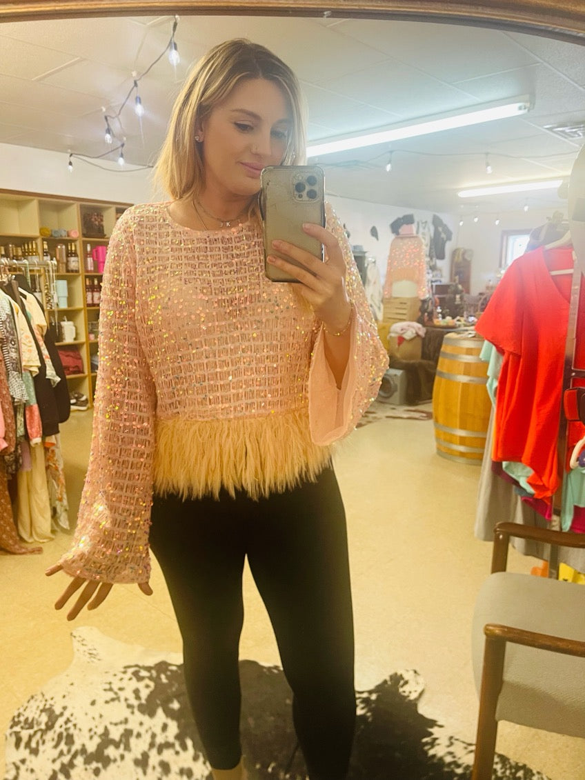 - Features: knitted top with soft sheer underlay for comfort, holographic sequins, bell sleeve, midi crop, peach feathers, relaxed fit, mild stretch